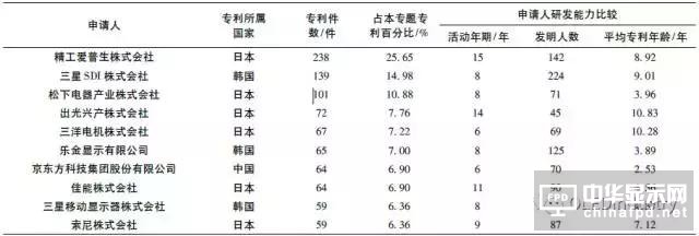 在OLED 設備技術領域,主要申請人之間的技術各有千秋,排名前五的申請人綜合實力較強,尤其是排名第一的精工愛普生,參見表4。
