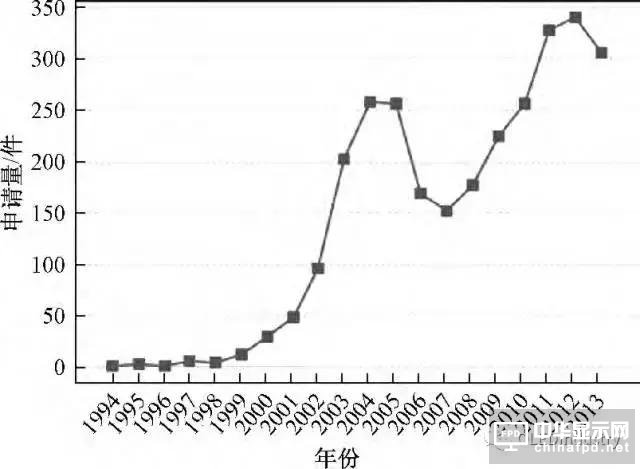 2004—2013 年這一階段OLED 設備的專利申請數量先下降,從2007 年開始又逐漸上升,在每年的申請量都大于150 件,對OLED 的研究和一些相關的技術方面變得相對成熟,對其重視程度只增不減。