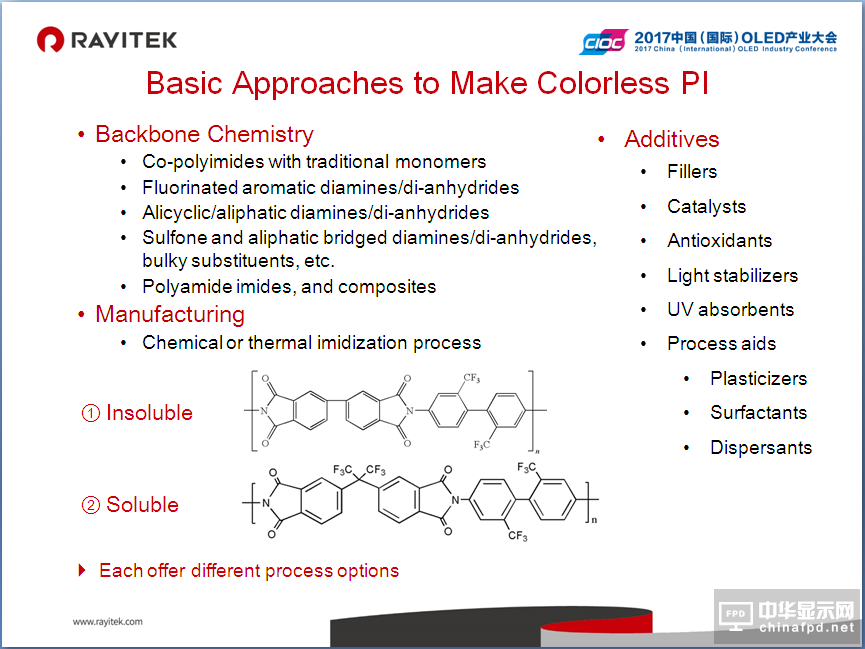 Rajan K.Kanakarajan博士介紹,瑞華泰于2005年在深圳成立,一直致力于高性能聚酰亞胺材料的研發與生產,目前已經成為中國自有技術聚酰亞胺產業領跑者。針對OLED柔性發展需求,瑞華泰推出OLED顯示用聚酰亞胺解決方案,向產業提供數種薄膜或樹脂形態的聚酰亞胺產品,具備杰出的熱性能、力學性能、光學性能,柔性等,以應對OLED中不同結構、組件、工藝、設計中的材料應用需求。