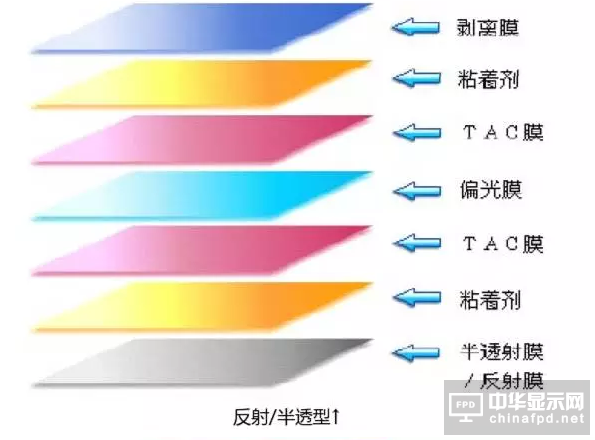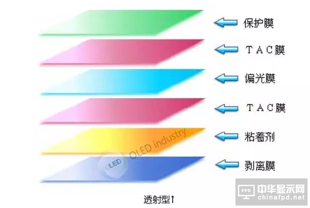 由偏光(guang)膜(PVA)、保護膜(TAC)、壓敏(min)膠層(ceng)、離型膜、保護膜、光(guang)學補(bu)償膜等符合而(er)成,基本結構(gou)是兩層(ceng)TAC膜夾一層(ceng)拉伸后的(de)PVA膜。