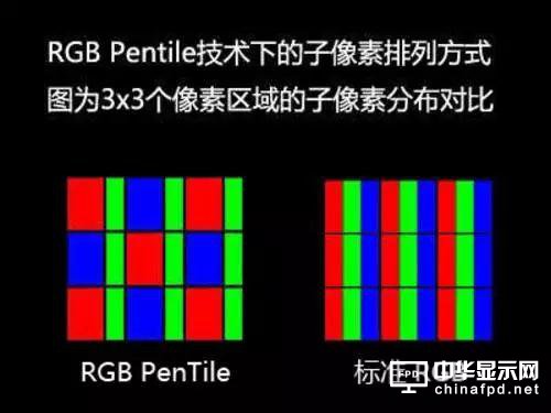 了解了子像素概念,那么就進入今天的主題——子像素的排列,上面提到了子像素的設計分為兩種一種是傳統的RGB排列,一種是RGB PenTile排列方式,那這兩種排列究竟是怎樣的餓呢?