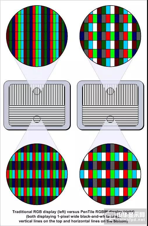 下圖是 PenTile 與傳統結構在顯示技術上的差別。傳統的 RGB 像素,排列整齊一致,如圖顯示一條白線,每個像素里的 RGB 要開到最亮,要顯示一條黑線,像素里的 RGB 全部關閉。PenTile 則每一色都是單獨的像素,可以排列成棋盤狀,因為色彩之間沒有關連,所以每個像素都能與任何周遭像素結合顯示,也就是 RGBW 白四色能任意結合,如圖只用兩色就能顯示白線與黑線,而傳統則需用三色。(下圖中左側為傳統紅綠藍顯示,上圖為直線、下圖為橫線;圖右側則為 PenTile 結構,上圖為直線、下圖為橫線。)