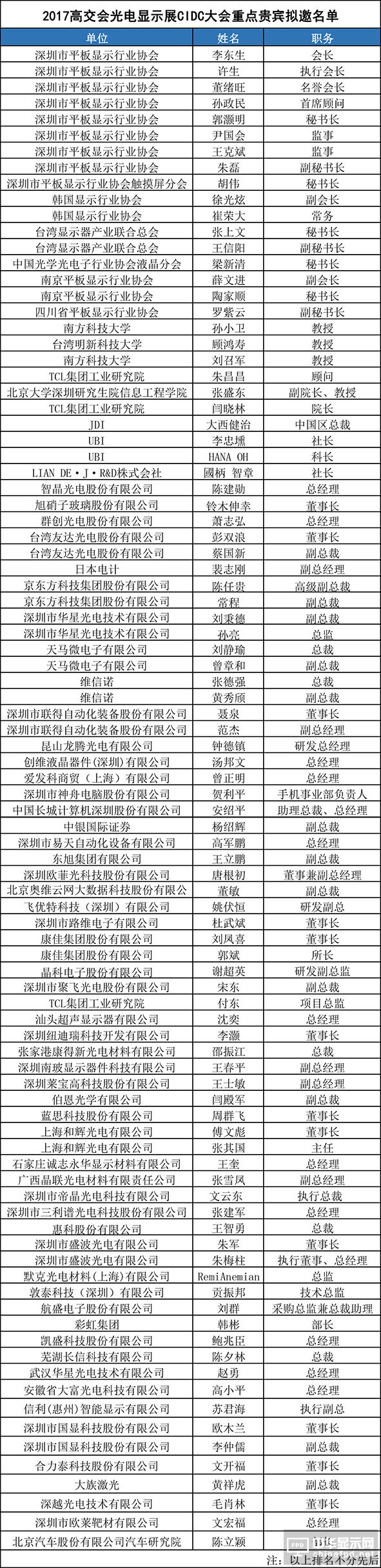第十三屆中國(guo)(guo)國(guo)(guo)際顯(xian)(xian)示(shi)(shi)大會(hui)(hui)(CIDC2017)以(yi)“創新與超越”為(wei)主題,涵蓋顯(xian)(xian)示(shi)(shi)峰會(hui)(hui)、“聯得裝備”圓桌高峰論壇(tan)及(ji)人工智能(neng)即將來襲·全面(mian)屏(ping)的(de)變數-2017手機黑科(ke)技(ji)(ji)技(ji)(ji)術(shu)及(ji)投資(zi)峰會(hui)(hui)。大會(hui)(hui)將邀請三星、LG、JDI、維信諾、華(hua)星光電(dian)(dian)(dian)(dian)(dian)、友達、京(jing)東方(fang)、天馬(ma)微(wei)電(dian)(dian)(dian)(dian)(dian)子(zi)、和(he)輝光電(dian)(dian)(dian)(dian)(dian)、信利等(deng)面(mian)板(ban)廠(chang)(chang)商(shang)(shang),康寧、默克、凸版印刷、聯得裝備、東電(dian)(dian)(dian)(dian)(dian)、日東、上海(hai)微(wei)電(dian)(dian)(dian)(dian)(dian)子(zi)、康耐視、TOPCON、東麗(li)華(hua)科(ke)技(ji)(ji)、紐迪瑞科(ke)技(ji)(ji)等(deng)材料和(he)裝備廠(chang)(chang)商(shang)(shang),創維、康佳、TCL、海(hai)信、樂視、華(hua)為(wei)、小米等(deng)電(dian)(dian)(dian)(dian)(dian)視和(he)手機廠(chang)(chang)商(shang)(shang),航盛電(dian)(dian)(dian)(dian)(dian)子(zi)、天派電(dian)(dian)(dian)(dian)(dian)子(zi)等(deng)車載顯(xian)(xian)示(shi)(shi)廠(chang)(chang)商(shang)(shang),以(yi)及(ji)國(guo)(guo)際信息顯(xian)(xian)示(shi)(shi)學會(hui)(hui)(SID)、日本(ben)畫質學會(hui)(hui)(SPQE)、韓國(guo)(guo)顯(xian)(xian)示(shi)(shi)行(xing)(xing)業協(xie)(xie)會(hui)(hui)(KDIA)、臺灣顯(xian)(xian)示(shi)(shi)器產業聯合(he)總會(hui)(hui)(TDUA)、中國(guo)(guo)光學光電(dian)(dian)(dian)(dian)(dian)子(zi)行(xing)(xing)業協(xie)(xie)會(hui)(hui)液晶分會(hui)(hui)(CODA)等(deng)國(guo)(guo)內(nei)外行(xing)(xing)業協(xie)(xie)會(hui)(hui)代表(biao)性的(de)企業家(jia)、技(ji)(ji)術(shu)專家(jia)、學者、教授、工程師以(yi)及(ji)金融界、投資(zi)界、新聞媒(mei)體界的(de)精英(ying)人士300余人共同參(can)會(hui)(hui)。