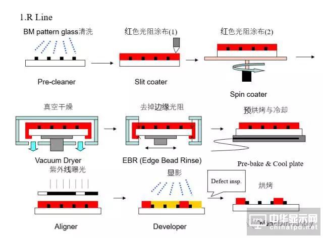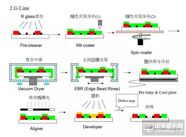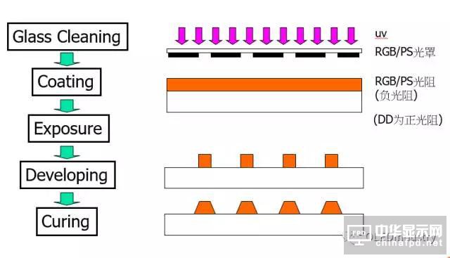 負光阻制程 :光阻沒(mei)照到紫外光的部份會(hui)在后續顯影步驟中被移除(chu)。如 : R, G, B, PS.
