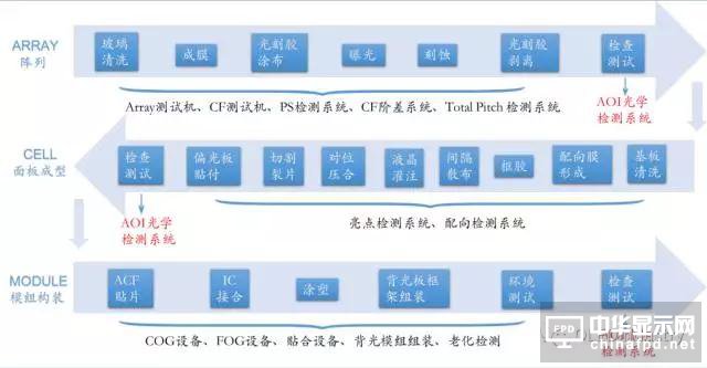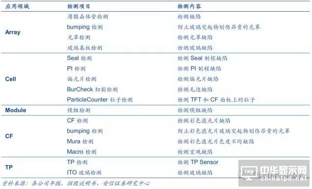 面板制造可分為 Array 、Cell 、Module 三道工序,三道工序均需要引入 AOI 檢測設備 ,且每一制程要求的檢測項目各不相同,需 根據應用場景 對設備進行針對性的開發。