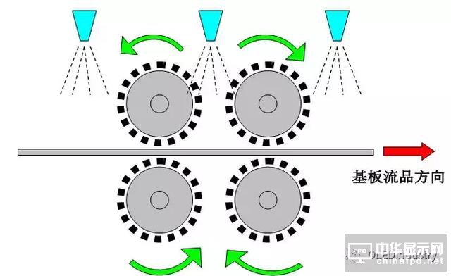 刷洗的主要目的是利用刷子與玻璃基板的之間的摩擦作用來去處污垢。對于基板玻璃上的大于5μm的無機物顆粒的去處效果非常好。一般用柔軟耐磨的尼龍材料來制作刷洗使用的刷毛,每一根刷毛的直徑一般在0.1mm以下。下圖是刷洗裝置的側面示意圖: