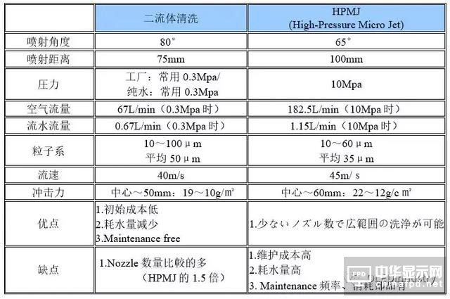 針對傳統的高壓水清洗方式,二流體清洗有其優勢。下表列出了二者的差異點: