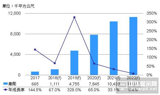 2017~2022年大陸廠商6代及以下AMOLED面板產能變化及預測 (中性情境)