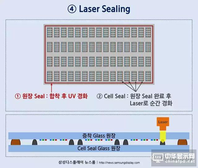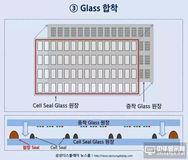以下是封裝過程的第三階段:“膠結”。膠結是將玻璃和玻璃密封上下疊加到現有蒸鍍工藝上的過程。通過這個過程,分離的OLED玻璃合并為一個。