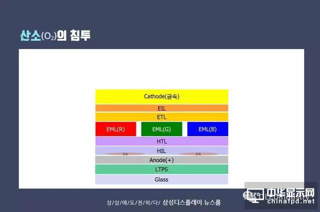 如果氧氣(O2)滲透到面板的間隙中,則處在EML的最上層的陰極部分和EIL層之間的接觸區域(界面)發生氧化,使得陰極和EIL變寬并且接觸變得很差。如果發生這種情況,電子將不能在陰極和EIL之間正常傳輸,從而導致部分像素不能發光(黑點)。
