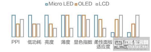 Micro LED、LCD和OLED對比(越高越好)