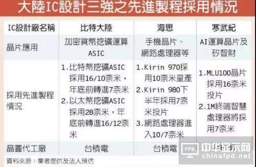今年大陸IC設計業者異軍突起,包括專攻加密貨幣挖礦運算特殊應用芯片(ASIC)的比特大陸、華為旗下手機芯片設計廠海思、以及正式推出人工智能(AI)加速運算芯片的寒武紀等三強出線,晶圓代工龍頭臺積電通吃16納米及7納米等先進制程代工訂單,成為最大受惠者。