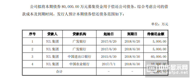 對于資金使用情況,TCL集團稱擬將本期債券8億元募集資金用于償還債務,其中償還廣發銀行總計1億元、中國進出口銀行6億元、中國農業銀行1億元,總計8億元。剩余募集資金將用于補充流動資金,以滿足日常生產經營需求,優化資本結構,降低經營風險。