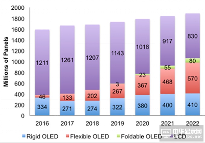 DSCC報告中預測,2021年OLED手機面板出貨量(包括剛性、柔性和可折疊)將超過LCD。就長期而言,全球OLED面板收入將繼續以兩位數增長率保持增長,到2020年達到32%的高峰,到2022年增至572億美元。