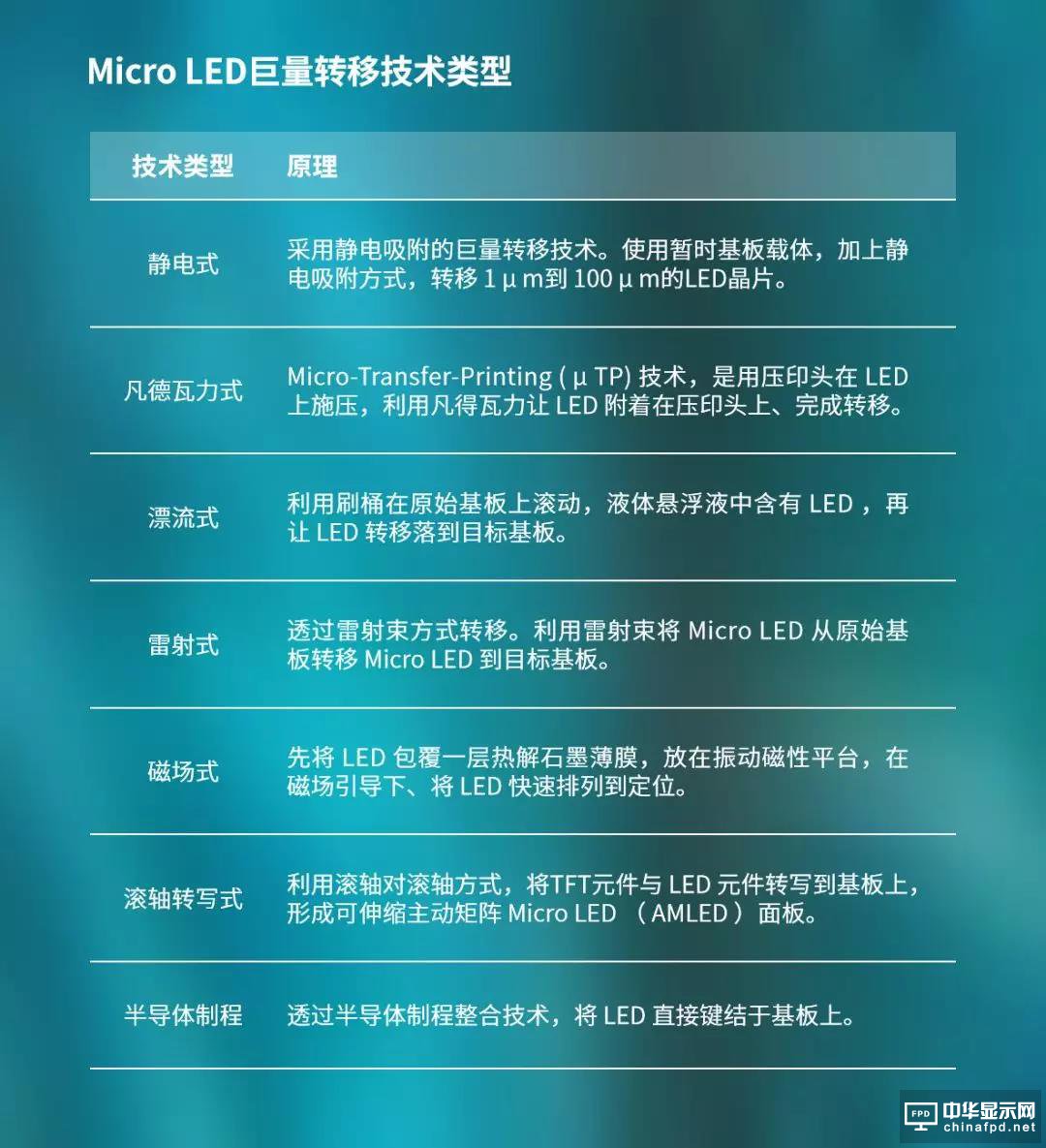 至于Micro LED,巨量轉移技術仍是影響Micro LED發展的關鍵。目前許多案子正在開發,顯示Micro LED技術的未來性確實值得期待。只是現階段每一家廠商所發展的Micro LED,都有不同的生產制程和轉移方法,相關技術都是自己研發,都是機密(參考下表)。
