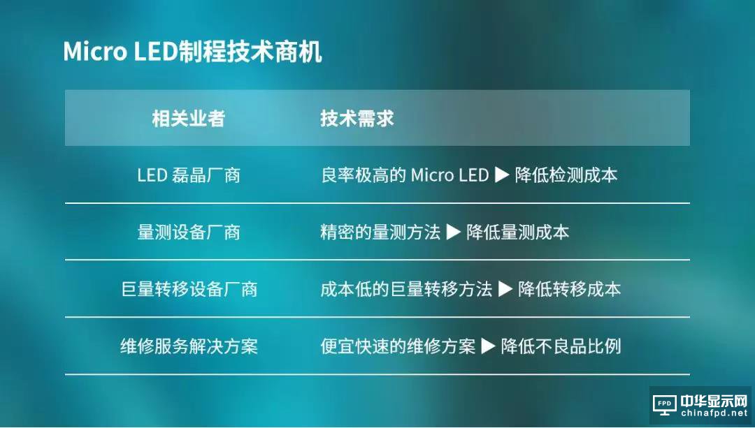 如果LED供應商可以把Micro LED做到良率極高、高到讓客戶不需要量測,這是一個值得努力的方向。又或者設備商可以開發出很精密的量測方法,讓量測成本下降,這也是一個商機。若有廠商能夠開發出成本便宜的巨量轉移技術、并且轉移效率極高,又是一個機會。假設Micro LED轉移后、還是有瑕疵品,但有設備技術能夠便宜快速維修,還是一個機會。技術發展初期,挑戰很多,但機會也多。