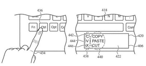 而在這份專利中,蘋果選擇在鍵盤的空格鍵和筆記本的觸控板中添加一個輔助顯示屏,輔助顯示屏僅顯示一些與鍵入的文字相關聯的單詞或詞組,或者是對單詞的一些聯想。此外,當用戶按下Ctrl、Alt這樣的功能按鍵時,顯示屏也能夠顯示一些按鍵組合的功能。