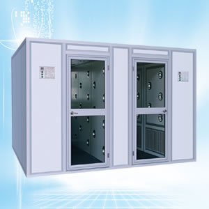 風淋室 的作用: 風淋室是人員進入潔凈室無塵車間所必備的凈化設備,通用性強,可與所有的潔凈室和潔凈廠房配套使用,工作人員進入車間時,必須通過此設備,用強勁潔凈的空氣,由可旋轉噴嘴從各個方向噴射至人身上,有效而迅速清除去附著在衣服上的灰塵、頭發、發屑等雜物,它可以減少人進出潔凈室所帶來的污染問題。風淋室的兩道門電子互鎖,可以兼起氣閘室的作用,阻止外界污染和未被凈化的空氣進入潔凈區域。杜絕工作人員將頭發,灰塵、細菌帶入車間,達到工作場地嚴格的無塵凈化標準,生產出高質量的產品