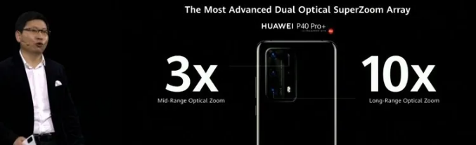 華為 P40 Pro上采用潛望式長焦鏡頭,支持5倍光學變焦、10倍混合變焦、以及50倍最大變焦。同時首次在長焦上加入RYYB陣列,支持4K延時攝影。
