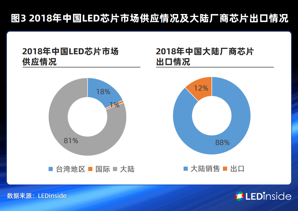 出口方面,2018年大陸芯片出口率為12%,包括三安、華燦在內的大陸廠商,芯片已經直接銷售至臺灣、韓國等市場。