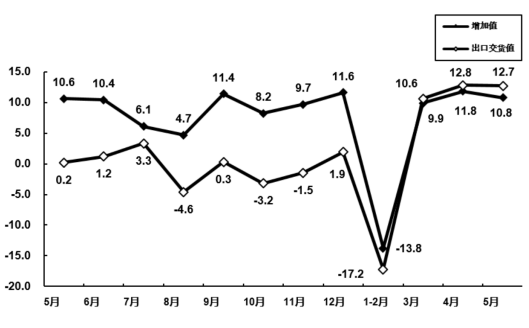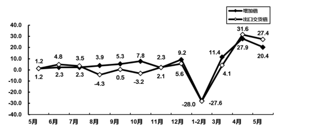 圖1:2020年5月電子信息制造業增加值和出口交貨值分月增速(%)