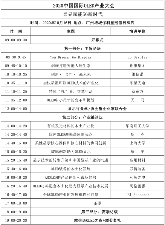 在此背景下,由中國電子視像行業協會主辦,廣州市工業和信息化局、廣州市增城區人民政府承辦,深圳市平板顯示行業協會執行的第五屆“2020中國國際OLED產業大會”將以“柔顯賦能5G新時代”為主題,于2020年10月16-17日在廣州增城打造OLED全產業鏈交流對接的平臺。