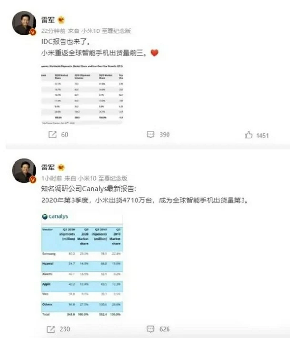 雷軍看到這樣的成績很欣慰,畢竟整整等了六年,畢竟2014年以前小米一直全球前三,2020年重返前三,雷軍高興得連發兩條動態慶祝。其實去年雷總就表示過出貨量距離前三不遠了,如今Q3季度終究是追上了前面的Apple,小米還在有效地增長,甚至這次是逆勢增長。在面對行業低谷的時候,新機發布節奏不慌不忙,技術上的創新也層出不窮,小米10系列、Redmi K30系列、小米10至尊紀念版和Redmi K30的紀念版本,還有面向海外的小米10T等,小米10的高端之路走得很成功,熱賣成了小米擠進前三的一個關鍵。