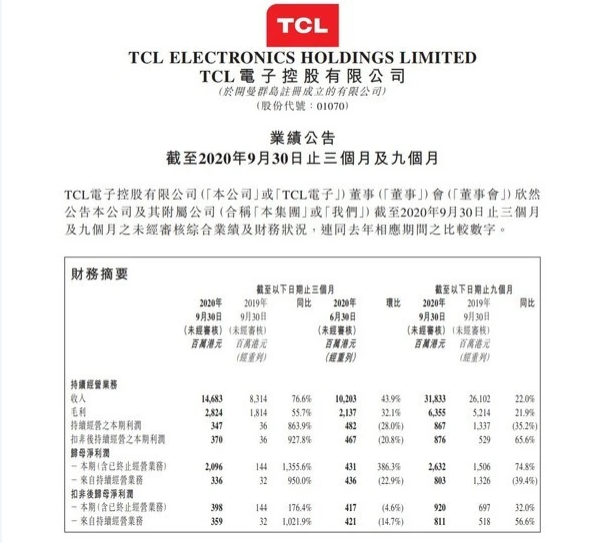 TCL電子日前發布了2020年第三季度財報,數據顯示,TCL電子三季度營收146.83億港元,同比增長76.6%,歸母凈利潤20.96億港元,同比增長1355.6%。TCL品牌電視機第三季度銷售量724萬臺,同比增長49.7%。另外,TCL電子旗下互聯網公司雷鳥科技第三季度收入同比增長78.7%,其中會員業務收入同比增長82.3%,增值業務收入同比增長300%。