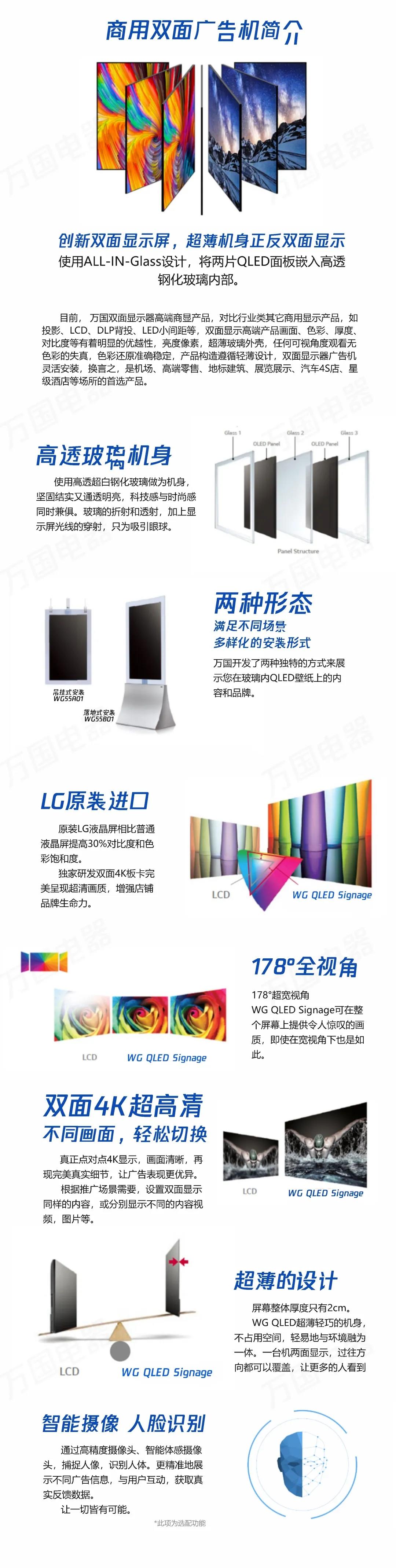 深圳市萬國電器有限公司是一家集研發、生產、銷售于一體的大型廣告機廠家,11年專注商用顯示領域,主要為客戶提供OLED透明屏幕、OLED透明廣告機,雙面廣告機、立式廣告機、超薄雙面廣告機、液晶玻璃、雙面顯示模組、數字標牌、教育一體機、觸摸一體機、LED液晶面板、OLED柔性拼接屏、酒店顯示系統、多功能會議系統、多媒體教學系統等產品,在深圳OLED、 LCD廣告機廠家中處于領先地位。