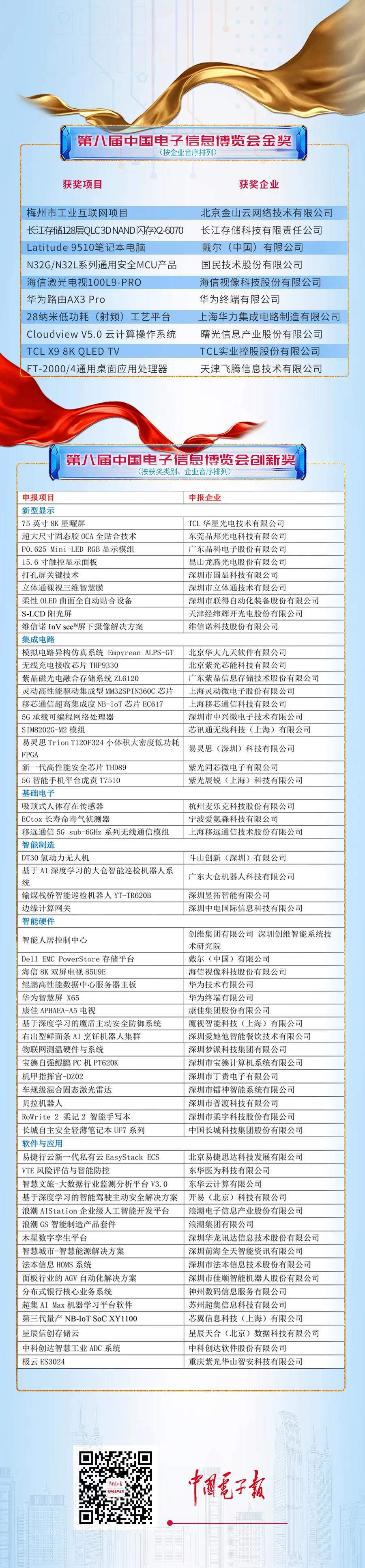 本次評審范圍為參加本屆中國電子信息博覽會的創新產品與應用。具體分類包括:新型顯示、集成電路、基礎電子、智能網聯與新能源、智能硬件、信息技術創新應用、智能制造等,對其中表現突出的產品與應用經過申報評審后獲得中國電子信息博覽會金獎、創新獎。