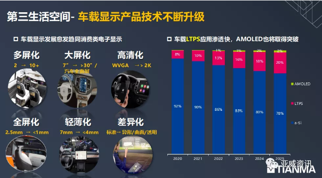 二是車載顯示在未來被人們定義為除了家和公司之外的第三生活空間,且越來越接貼近消費者的需求,未來車載顯示屏使用越來越多,從現在的三五塊增加到十塊甚至12塊以上,從7、8、12吋為主流,到20、30吋甚至40吋以上發展,且技術也在不斷地進行迭代和升級,為配合新能源汽車低能源消耗、低碳排放、輕車身,顯示的模組也被要求更輕量化。在形態方面,車載LTPS、AMOLED的技術也會有所突破進入車載領域。