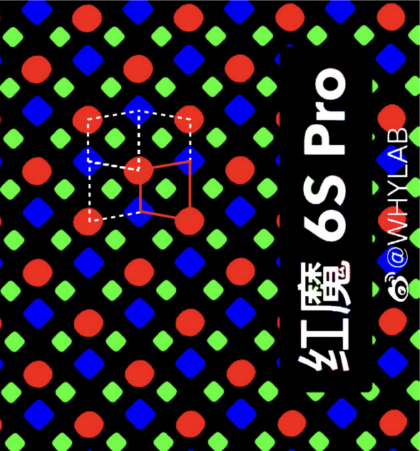 這款產品搭載6.8 英寸AMOLED全面屏,并依然保持了全球領先的最高165Hz刷新率,屏幕供應商也依然是此前獨供紅魔90Hz、144Hz等系列產品的維信諾。值得一提的是,紅魔在發布會中首次提到了使用“晶鉆排列”。根據微博@WHYLAB 曝光的紅魔6S Pro顯微鏡圖片顯示,該手機使用的像素排列與維信諾2016年申請的已授權發明專利CN107887404 B《AMOLED像素結構及顯示裝置》中的像素排列一致,其中2組R和B子像素共同構成一個梯形。