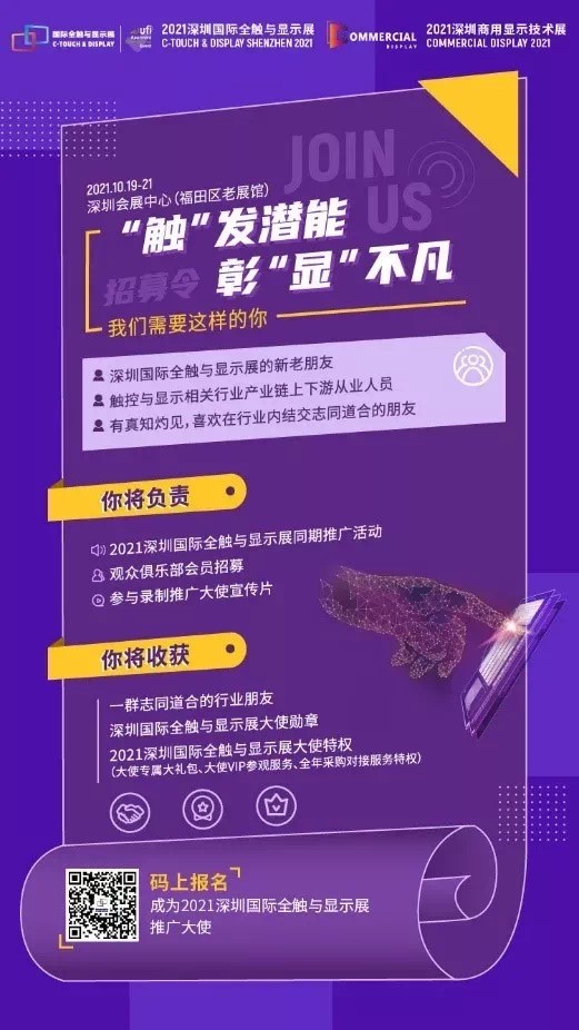 2021深圳國際全觸與顯示展將于10月19-21日在深圳會展中心(福田區老展館)舉辦,展會將吸引海內外1,000家參展商及品牌齊聚現場,展示創新產品及技術解決方案; 40,000 名來自模切加工、觸控/ 顯示面板、手機/ 平板電腦、背光模組、柔性線路板、家電電器、汽車裝配、醫療美妝、光伏/ 鋰電等行業的技術研發采購人員和企業管理者匯聚一堂。這無疑象征著整個觸控顯示行業具備向上向好的凝聚力,全面向市場釋放積極信號,為行業合作共贏注入強心劑。技術依然能提升,市場需求依然在,這或許就是目前觸控顯示產業依然蓬勃發展的根本原因之一。