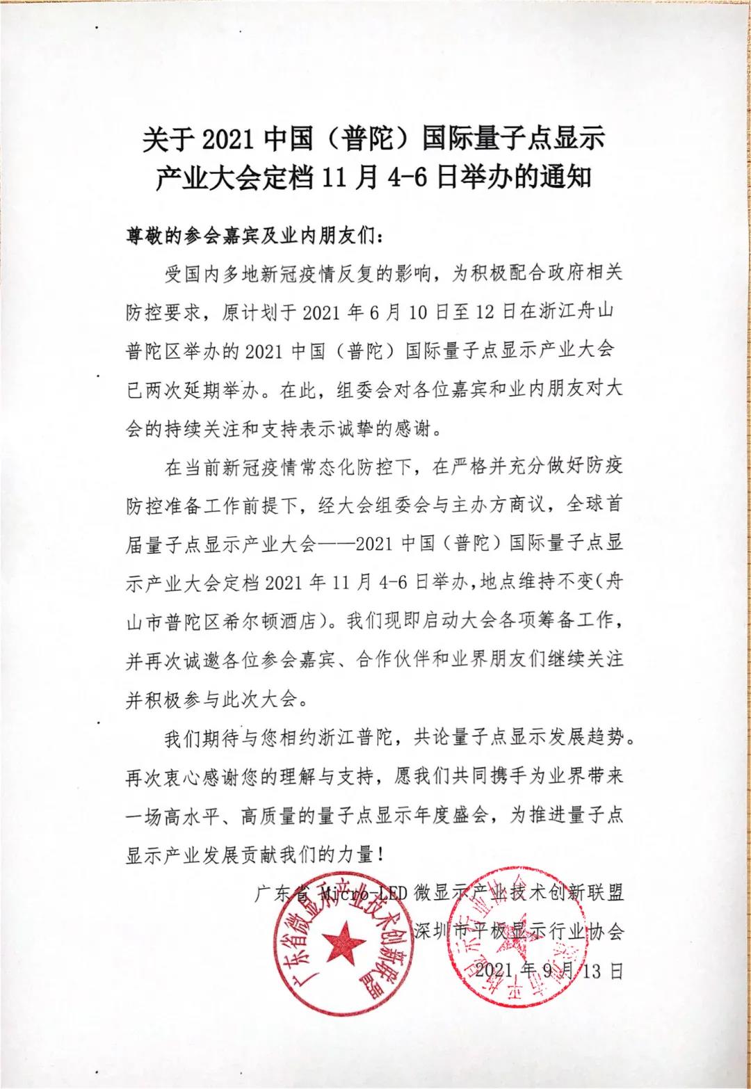受國內多地新冠疫情反復的影響,為積極配合政府相關防控要求,原計劃于2021年6月10日至12日在浙江舟山普陀區舉辦的2021中國(普陀)國際量子點顯示產業大會已兩次延期舉辦。在此,組委會對各位嘉賓和業內朋友對大會的持續關注和支持表示誠摯的感謝。