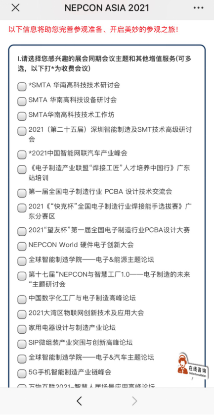 NEPCON ASIA 2021已進入開幕倒計時,預約參觀通道將于10月18日關閉,掃描文末二維碼,免費預約參觀,按照步驟完善您的個人信息后,您可以在后續頁面中勾選您有意向參與的活動(如下圖所示),愿我們的服務能帶給您美好的參觀體驗!