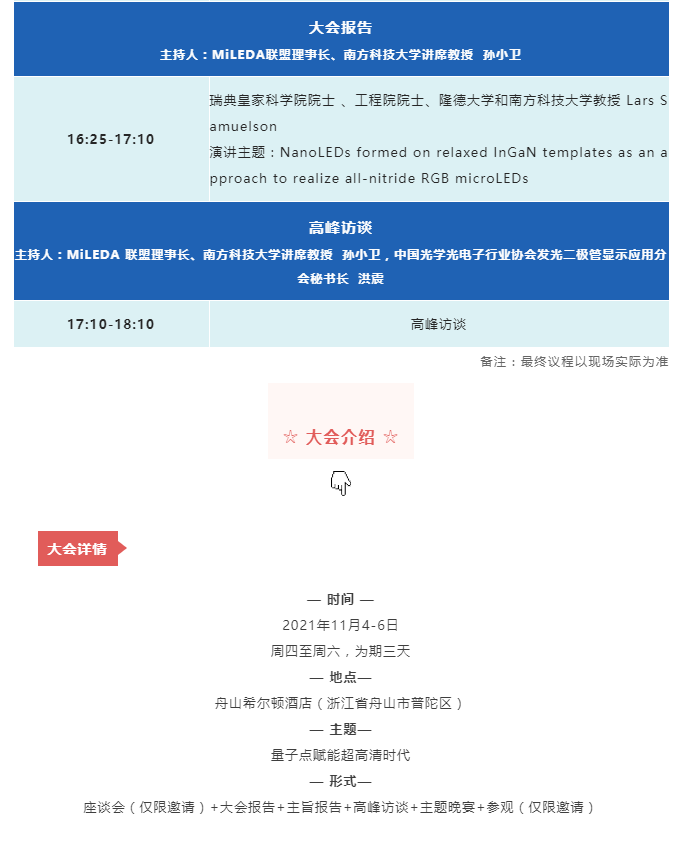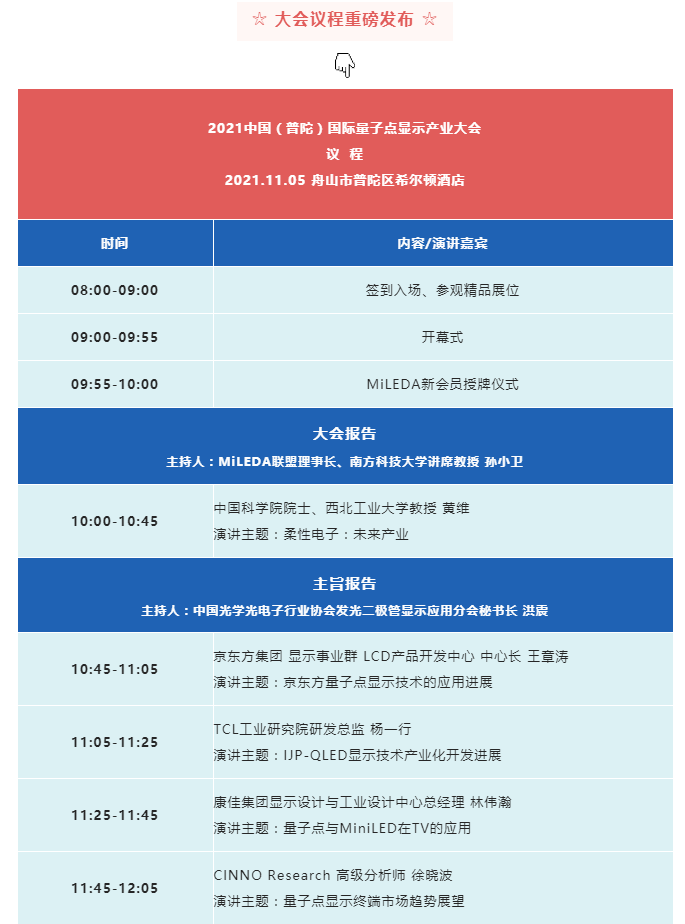 2021中國(普陀)國際量子點顯示產業大會將于11月4日-6日,在浙江舟山普陀區舉行!本次大會以“量子點賦能超高清時代”為主題,邀請國內外知名行業專家、學者、企業高層等參與,共同迎接量子點顯示技術發展新機遇。
