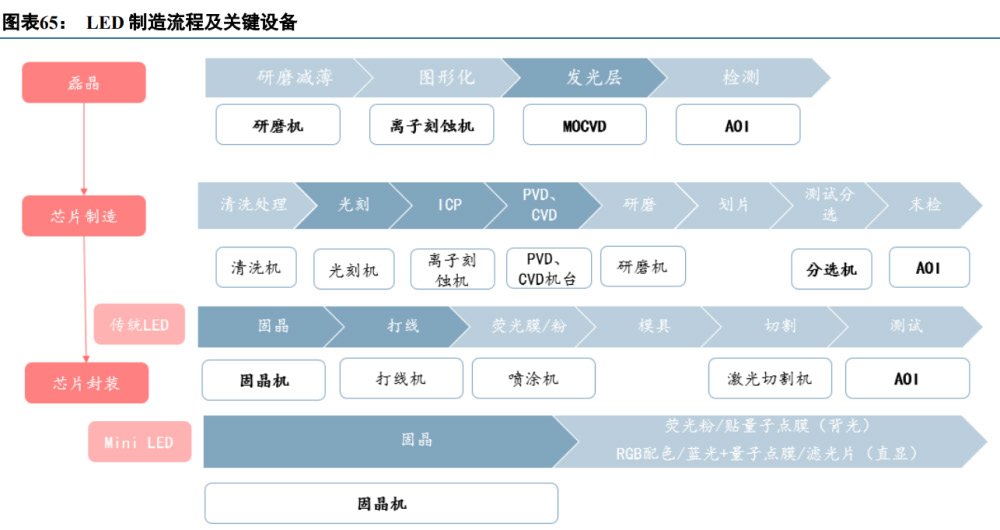 Mini/Micro LED芯片制造流程與傳統LED芯片類似。與傳統LED芯片相同,Micro/Mini LED芯片一般采用刻蝕和外延生長的方式制備,芯片制作流程主要包括:襯底制備、中間層制備、臺階刻蝕、導電層制備、絕緣層制備、電極制備等,涉及比較重要的設備有刻蝕機和沉積設備(MOCVD)等。