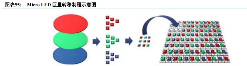 Micro LED目前面臨的最大難點是巨量轉移,目前技術尚未成熟。巨量轉移指將Micro LED芯片轉移到由電流驅動的TFT基板上,并在微米級水平組裝成為二維周期陣列的過程。Micro LED轉移的像素顆粒數量極多(500PPI的5英寸手機屏幕需要800萬個像素顆粒)、尺寸極小(要求微米級安裝精度),每個像素包括RGB三個小燈珠,轉移像素三倍的小燈珠的同時保證精度是非常困難的。
