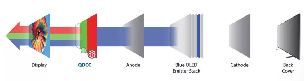 QD-OLED指的是帶有QD量子點技術的OLED面板,就是將QD-LCD中的QD量子點技術用于OLED面板上,在原有的OLED屏幕的構架下,多加了一個發光層,通過藍色OLED發出藍光,與紅色和綠色的量子點發出紅光和綠光相結合,最終形成RGB三原色,能讓色域覆蓋度更加有精準的表現。