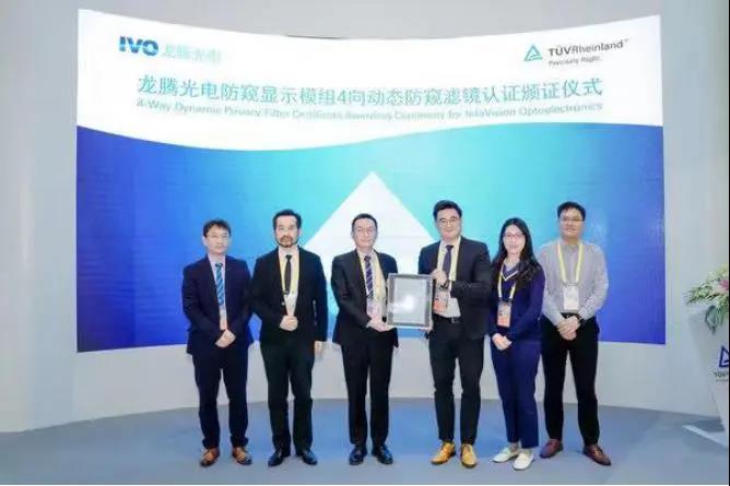 11月8日,全球領先的檢測、檢驗、認證、培訓、咨詢機構德國萊茵TUV集團 (簡稱“TUV萊茵”)亮相第四屆進博會,昆山龍騰光電股份有限公司副總裁鐘德鎮受邀出席TUV萊茵系列活動。活動上TUV萊茵大中華區電子電氣產品服務副總裁楊佳劼為龍騰光電頒發了全球首張防窺顯示模組4向動態防窺濾鏡認證證書,相比傳統的水平方向防窺技術,4向防窺濾鏡能夠幫助用戶實現更多應用場景下的屏幕信息保護,為用戶個人隱私保護提供有力支持。