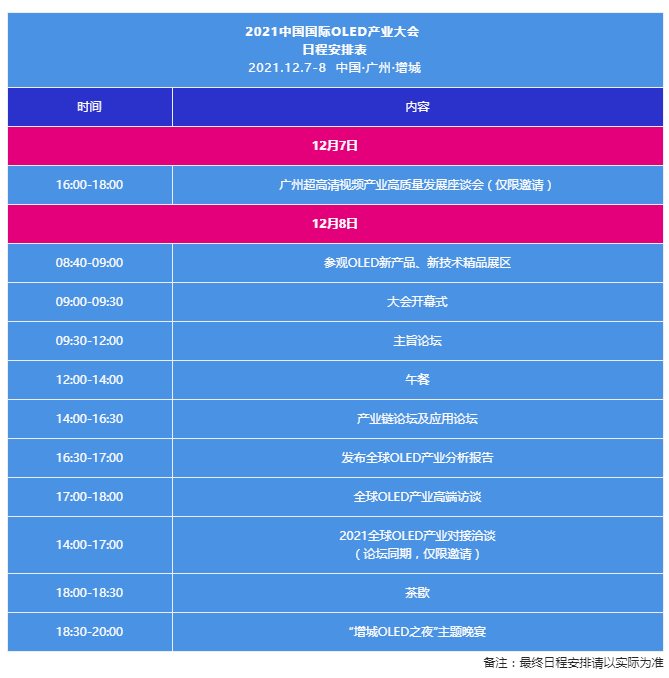 為進一步推動廣州市新型顯示產業高質量發展,中國國際OLED產業大會組委會聯合全球顯示學/協會、學術研究機構和OLED產業領軍企業,以“OLED引領產業新動能”為主題,將于2021年12月7日-8日在廣州增城舉辦“2021中國國際OLED產業大會”。