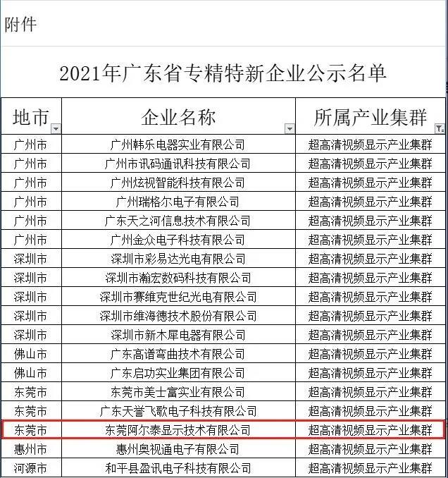 AET阿爾泰榮獲的“2021年廣東省專精特新企業”由廣東省工業和信息化廳評定,是繼“高新技術企業”、“廣東省工程技術研究中心”后的又一個省級及以上榮譽!同時,在“專精特新企業”名單中,AET阿爾泰是廣東省超高清視頻顯示產業集群中的十八家企業之一。