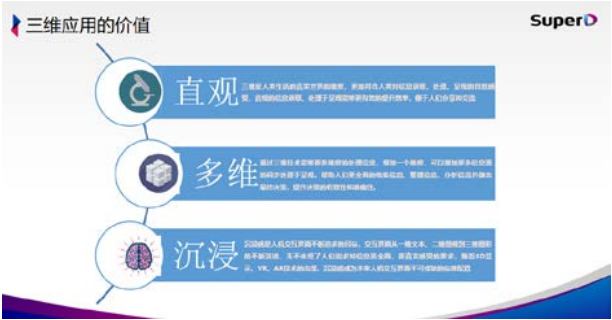 “VR/AR沉浸感就是三維應用里非常重要的特點,也是人機交互界面不斷追求的目標。”宋磊表示,交互界面從一維文本到二維圖像,再到三維圖像的演變,都體現了人們追求信息更全面的要求。隨著三維等技術的出現,沉浸感很可能成為未來人機交互界面不可或缺的標準配置。