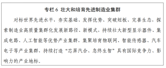 促進高質量集聚化發展。通過資源要素集聚、政策傾斜,推動產業鏈、資金鏈、人才鏈、技術鏈“四鏈合一”,持續提升新型顯示器件、集成電路、人工智能產業集群競爭力。統籌協調相關產業集群資源,提升上下游企業間協作配套水平,圍繞新型顯示、集成電路等優勢產業與家電、汽車、智能終端等領域“芯-屏-端”聯動發展,培育形成物聯網、汽車電子、服務器、智能傳感器等若干新一代信息技術交叉融合領域產業集群。