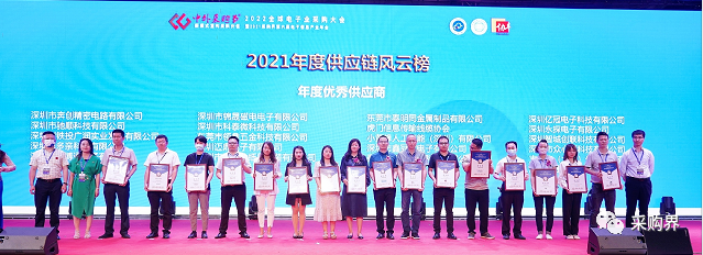 十佳金牌采購商、十佳金牌供應商、年度優秀供應商:他們是電子信息產業供應鏈領域年度最具標志性和影響力的高端獎項,力推持續發掘和培養一批電子信息產業供應鏈創新與應用的示范企業和領軍人才,為政府政策制定、行業示范對標、產業鏈采購尋源等提供支持。2021年度十佳金牌采購商獲獎名單:深圳創維-RGB電子有限公司、海爾(深圳)研發有限責任公司、深圳市九洲電器科技有限公司、深圳康佳通信科技有限公司、四川領歌智谷科技有限公司、深圳市綠米聯創科技有限公司、茂碩電源科技股份有限公司、深圳拓邦股份有限公司、深圳市普渡科技有限公司、深圳市銀星智能股份有限公司。