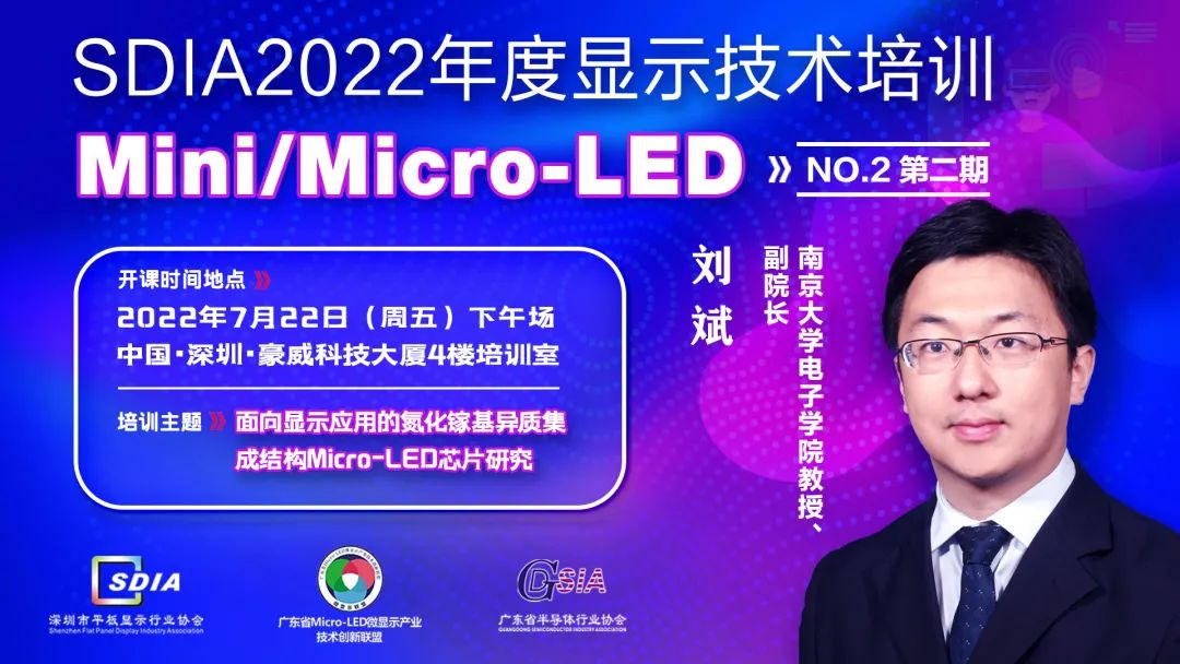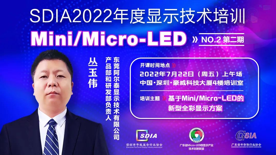 當下,Mini/Micro LED顯示產業風頭仍勁,持續占據顯示行業熱搜榜的前列。在市場大規模爆發前夕,正是企業蓄力的好時機!深圳市平板顯示行業協會致力于為會員單位搭建多種形式的溝通合作橋梁,為顯示行業從業人員打造進修育才的專業平臺。作為今年的顯示技術年度培訓之一,7月22日,我會將聯合廣東省Micro-LED微顯示產業技術創新聯盟、廣東省半導體行業協會共同舉辦2022Mini/Micro-LED顯示技術主題培訓,特別邀請到南京大學電子學院教授/副院長劉斌、阿爾泰產品部和研發部負責人叢玉偉為培訓講師,結合顯示行業及企業發展需要,給大家全面講解“面向顯示應用的氮化鎵基異質集成結構Micro-LED芯片研究”和“基于Mini/Micro-LED的新型全彩顯示方案”等熱門話題,助力企業立足顯示產業新領域、新市場,為未來開拓新興應用場景夯實基礎。