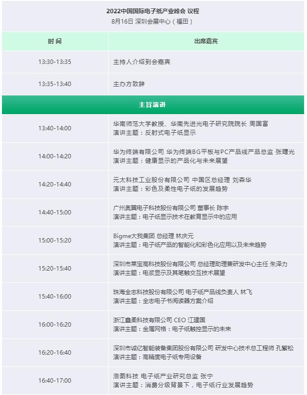 作為第十屆中國電子信息博覽會(CITE2022)同期論壇活動——2022中國國際顯示產業大會的系列活動之一,以“‘碳’為觀‘紙’ 多彩未來”為主題的2022中國國際電子紙產業峰會將于8月16日在深圳舉行。大會已邀請到華為、E Ink元太科技、廣州奧翼、Bigme大我集團、萊寶高科、全志科技、鑫柔科技、誠億智能裝備等名企,以及華南師范大學、洛圖科技等專業院校、研究咨詢機構,從顯示技術、行業發展、應用場景等方面做主題分享,共同為電子紙產業健康發展集思廣益。