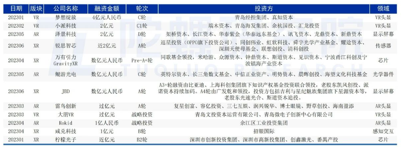 2023年(nian)上(shang)(shang)半年(nian)硬(ying)件企業榜單(dan)來看(kan),融資(zi)(zi)額排名前10的企業基本(ben)都達到(dao)了億級,并且(qie)所有(you)企業都是硬(ying)件,其中(zhong)涵蓋VR/AR品(pin)牌終端、顯(xian)示屏(ping)、傳(chuan)感器(qi)、芯(xin)片、光(guang)學器(qi)件等。夢想綻放(奇遇R)、小派科(ke)技、雷(lei)鳥創新、大朋R、Rokid等VR/AR頭(tou)顯(xian)廠商(shang)上(shang)(shang)半年(nian)皆已完成過億元融資(zi)(zi)。從投資(zi)(zi)方(fang)來看(kan),大部分融資(zi)(zi)案(an)例中(zhong)都有(you)政(zheng)府(fu)(fu)基金參與(yu),如青(qing)(qing)島(dao)經控集團、青(qing)(qing)島(dao)海發集團、余(yu)杭國投、長江資(zi)(zi)本(ben)、深圳天使(shi)母基金、青(qing)(qing)島(dao)文投資(zi)(zi)本(ben)等,相對于(yu)財投,更偏重戰略的地方(fang)政(zheng)府(fu)(fu)更青(qing)(qing)睞上(shang)(shang)中(zhong)游產業鏈硬(ying)件企業。