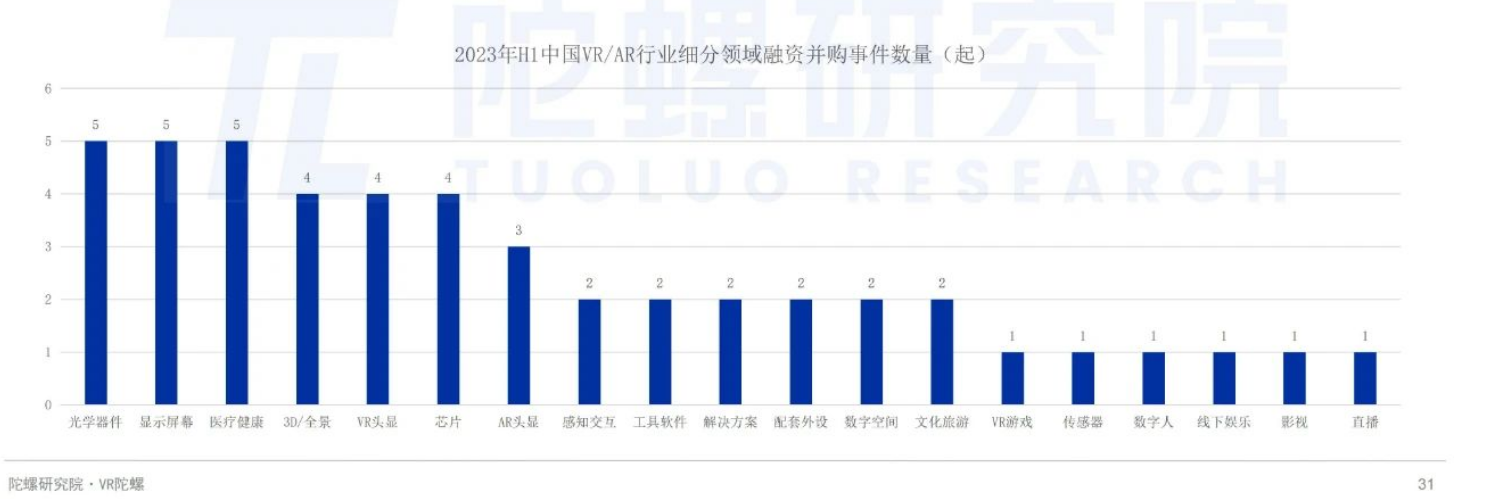 上半年中(zhong)國VR領(ling)域(yu)(yu)融(rong)資(zi)并購(gou)金額(e)(e)為(wei)9.5億元(yuan),同(tong)比(bi)下(xia)(xia)(xia)降69.5%;融(rong)資(zi)并購(gou)數(shu)量共15起(qi),同(tong)比(bi)下(xia)(xia)(xia)降66.7%。國內AR領(ling)域(yu)(yu)融(rong)資(zi)并購(gou)金額(e)(e)為(wei)6億元(yuan),同(tong)比(bi)下(xia)(xia)(xia)降68%;融(rong)資(zi)并購(gou)數(shu)量共9起(qi),同(tong)比(bi)下(xia)(xia)(xia)降18.2%。XR領(ling)域(yu)(yu)融(rong)資(zi)并購(gou)金額(e)(e)為(wei)7.9億元(yuan),同(tong)比(bi)下(xia)(xia)(xia)降69.6%;融(rong)資(zi)并購(gou)數(shu)量共24起(qi),同(tong)比(bi)下(xia)(xia)(xia)降50%。