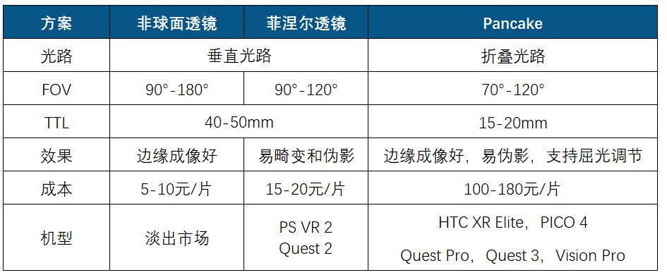 VR光(guang)(guang)學方案沿(yan)著“非球面透(tou)(tou)鏡(jing)-菲涅爾透(tou)(tou)鏡(jing)-Pancake”的路徑(jing)發展。此前菲涅爾透(tou)(tou)鏡(jing)因(yin)低成(cheng)本和可控的成(cheng)像(xiang)(xiang)質量(liang)(liang)(liang),成(cheng)為VR產(chan)品的主流方案。隨著消費者對(dui)VR的重量(liang)(liang)(liang)體(ti)積(ji)、成(cheng)像(xiang)(xiang)質量(liang)(liang)(liang)、佩戴體(ti)驗提出更高的要求,折疊光(guang)(guang)路原理的Pancake方案憑借輕薄優勢和優秀(xiu)的成(cheng)像(xiang)(xiang)質量(liang)(liang)(liang),以及趨于成(cheng)熟的量(liang)(liang)(liang)產(chan)工藝,成(cheng)為VR光(guang)(guang)學技術的進化方向。